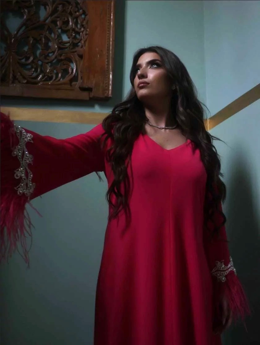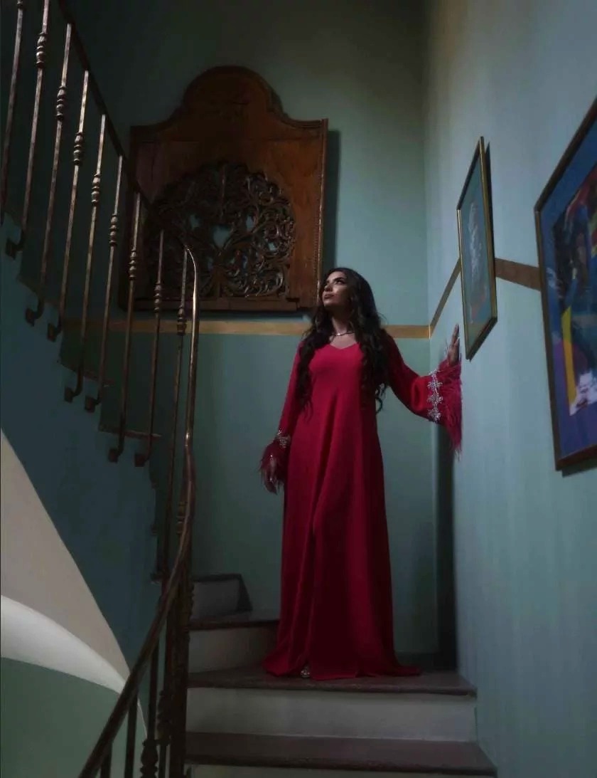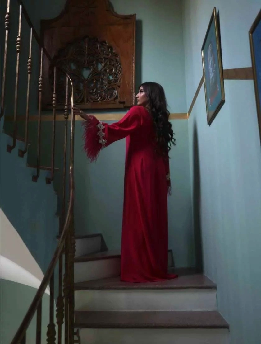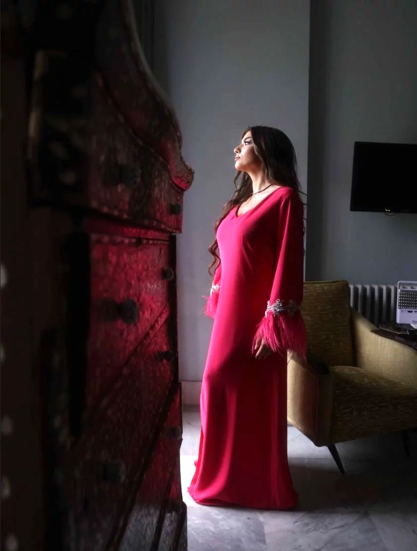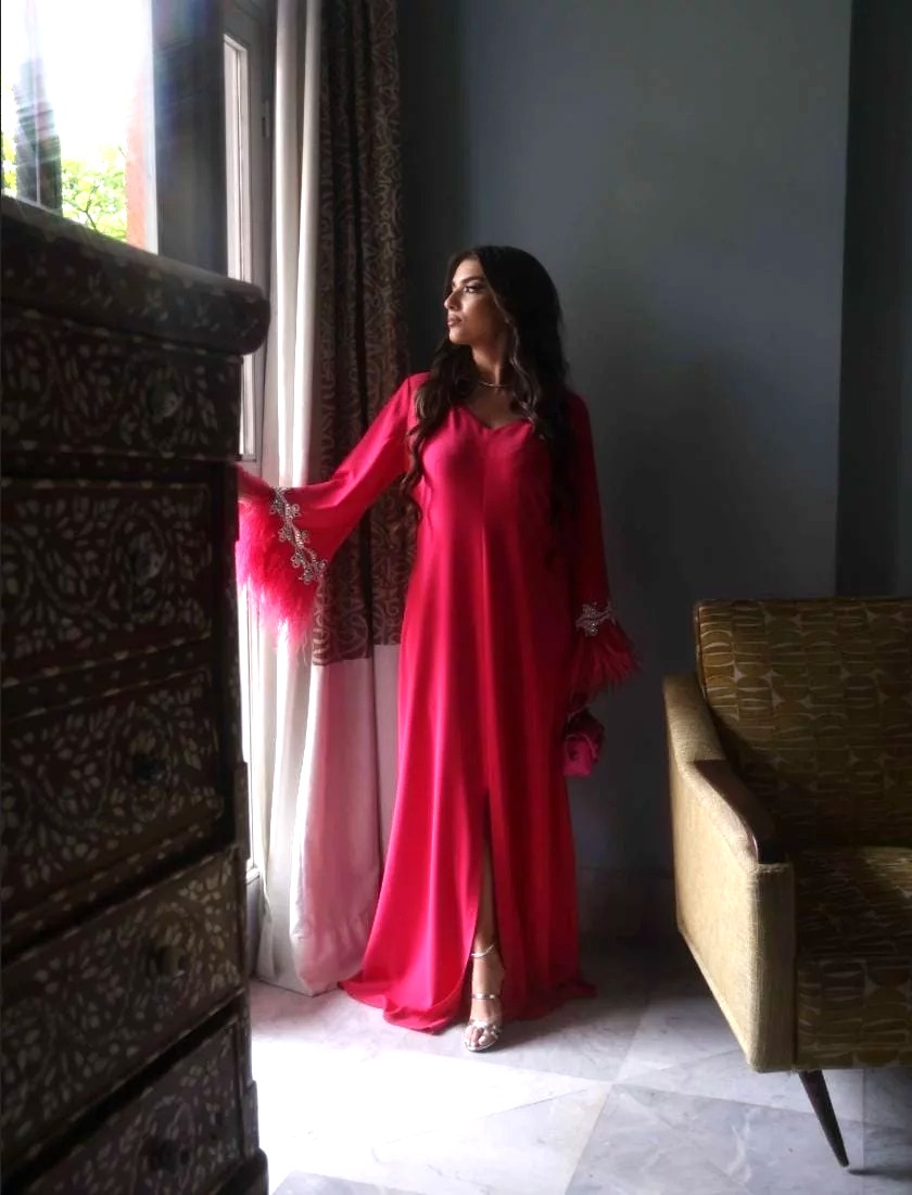A dress made with 100% crepe fabric studded with swaroviski crystals and real ostrich feather