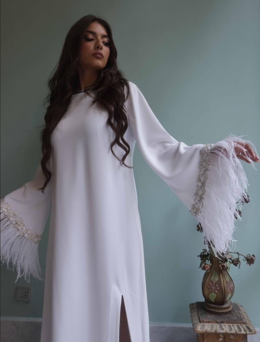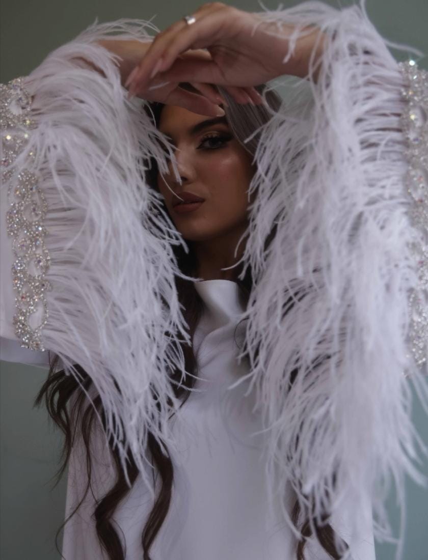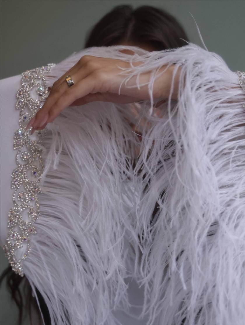 A dress made with 100% crepe fabric studded with swaroviski crystals and real ostrich feather